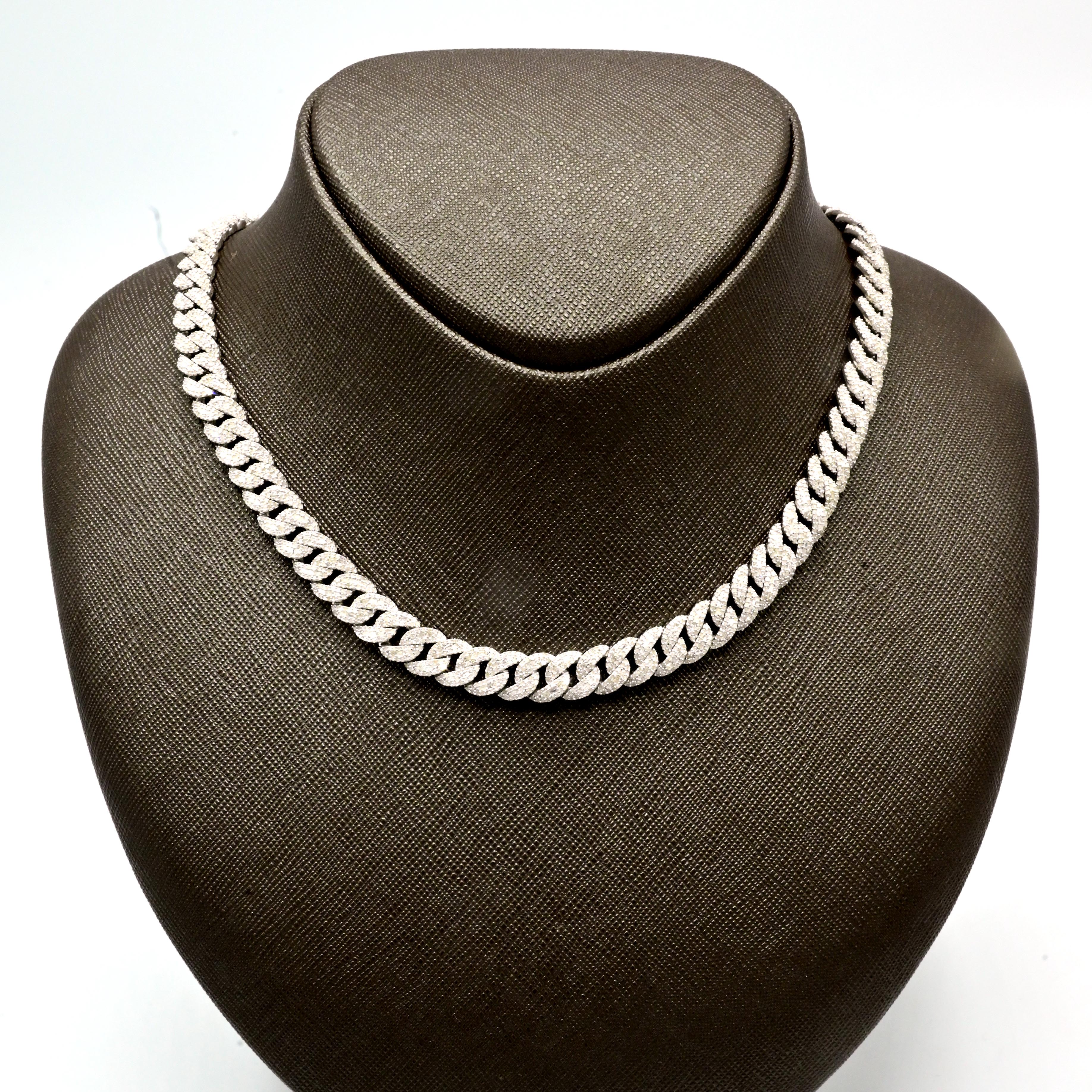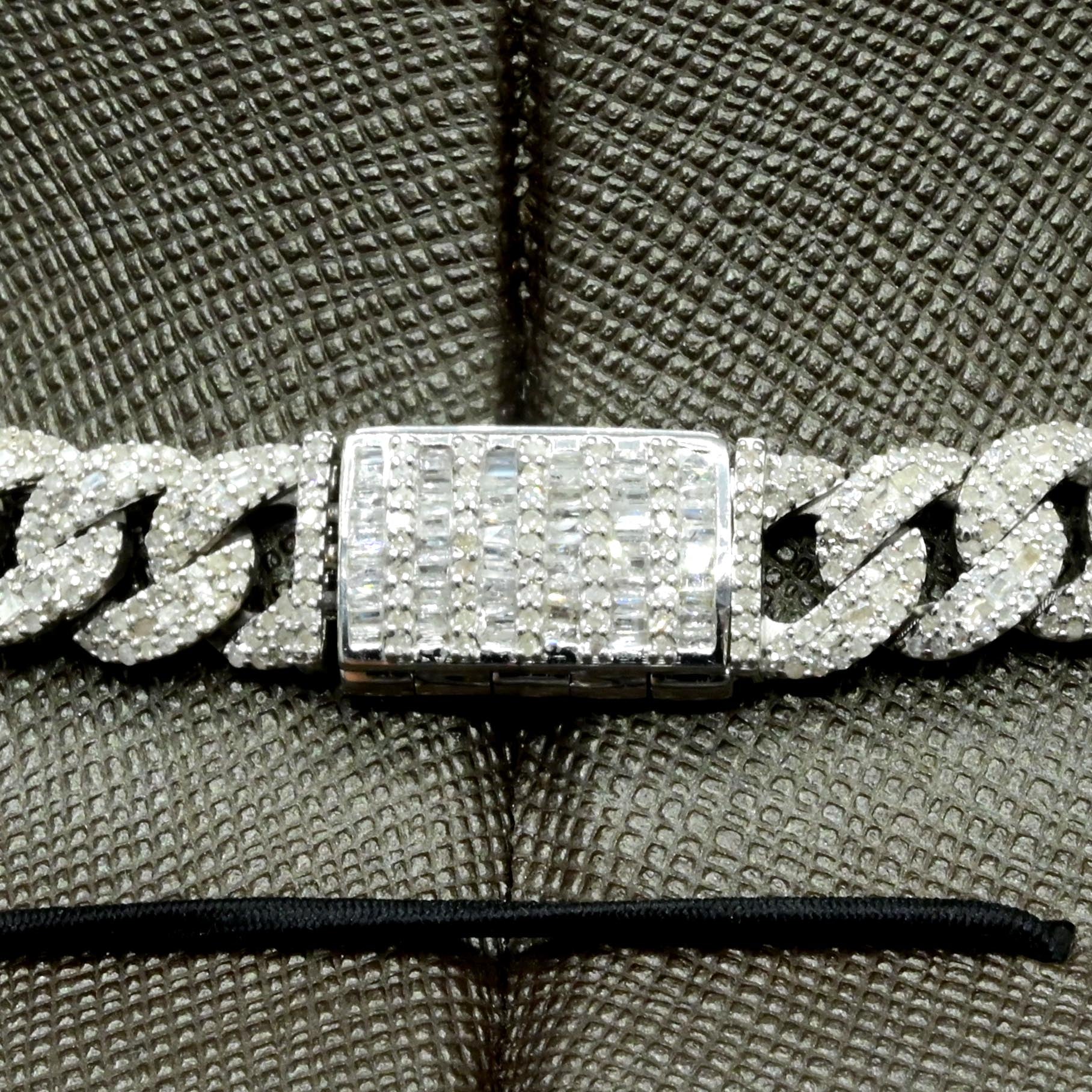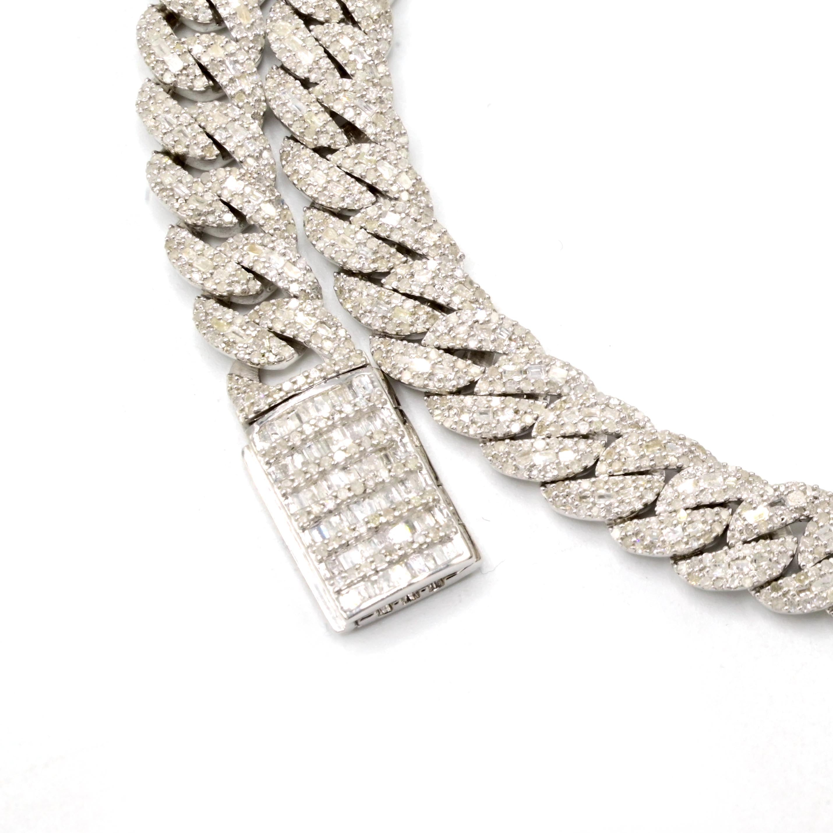 This 18" Cuban link necklace is expertly crafted from premium 925 sterling silver and measures 8mm in width, delivering a strong and masculine appeal. It is set with a combined total of 10.70 carats of both round and baguette diamonds, providing exceptional sparkle. With a weight of 59.44 grams, this necklace combines significant heft with meticulous craftsmanship for a distinguished, luxurious accessory.