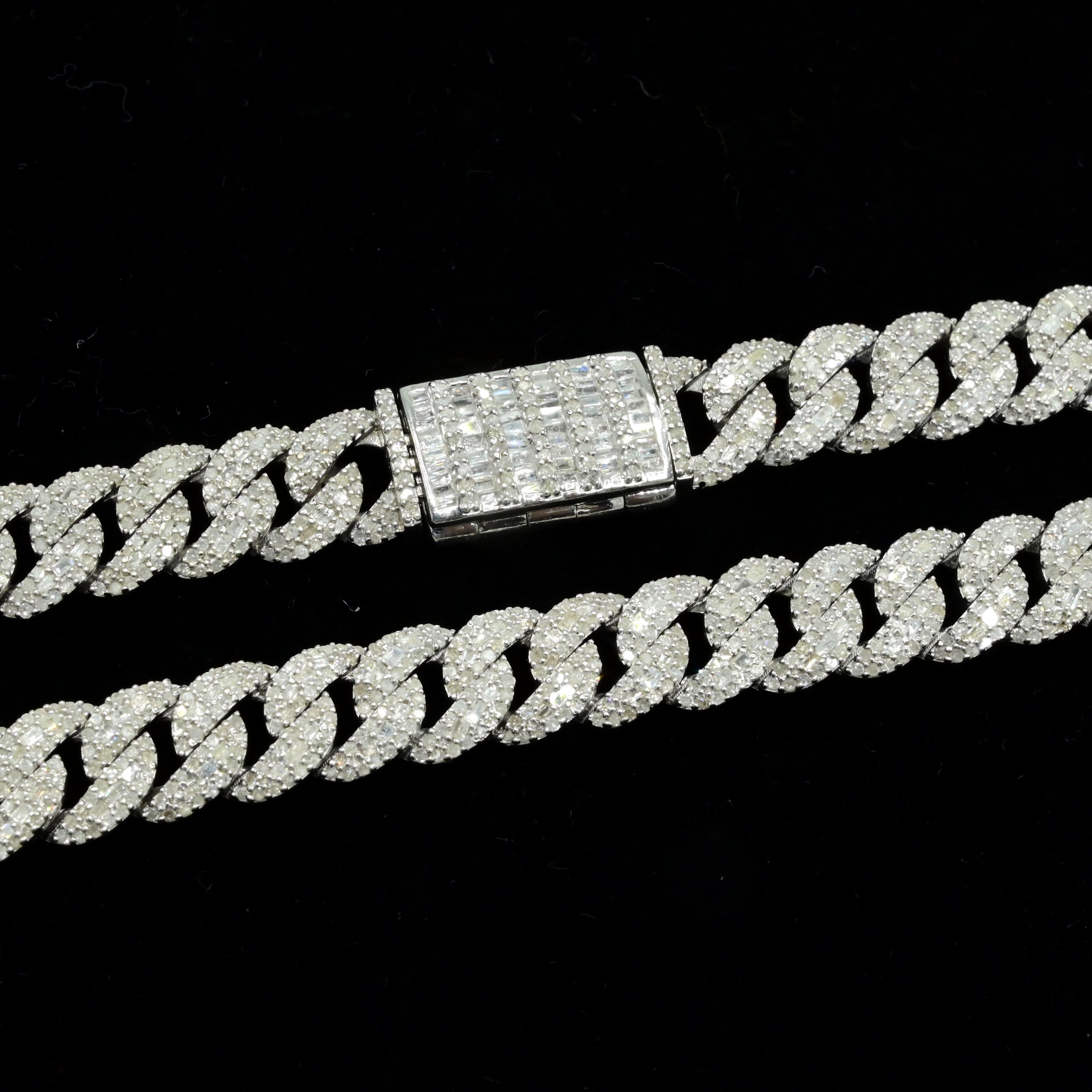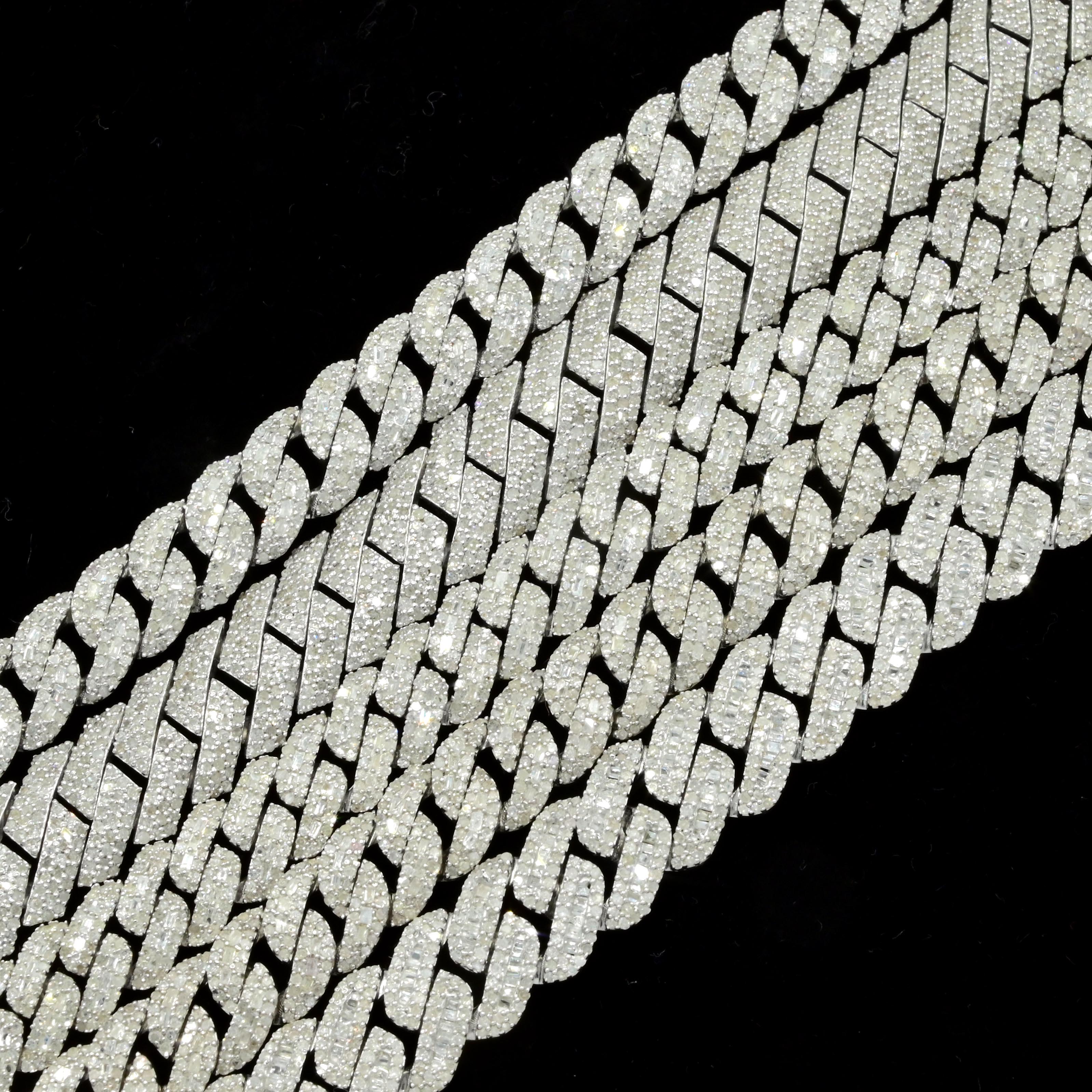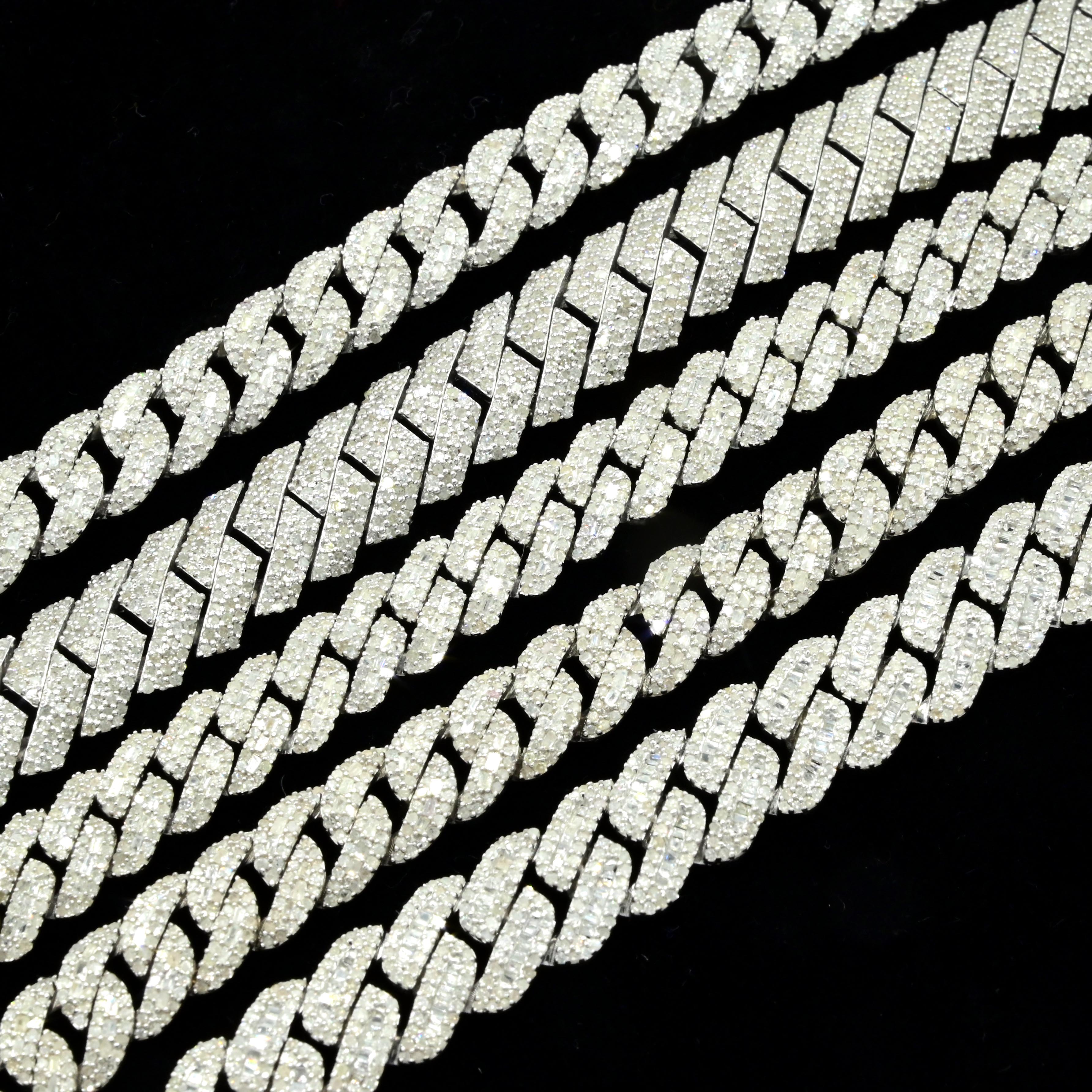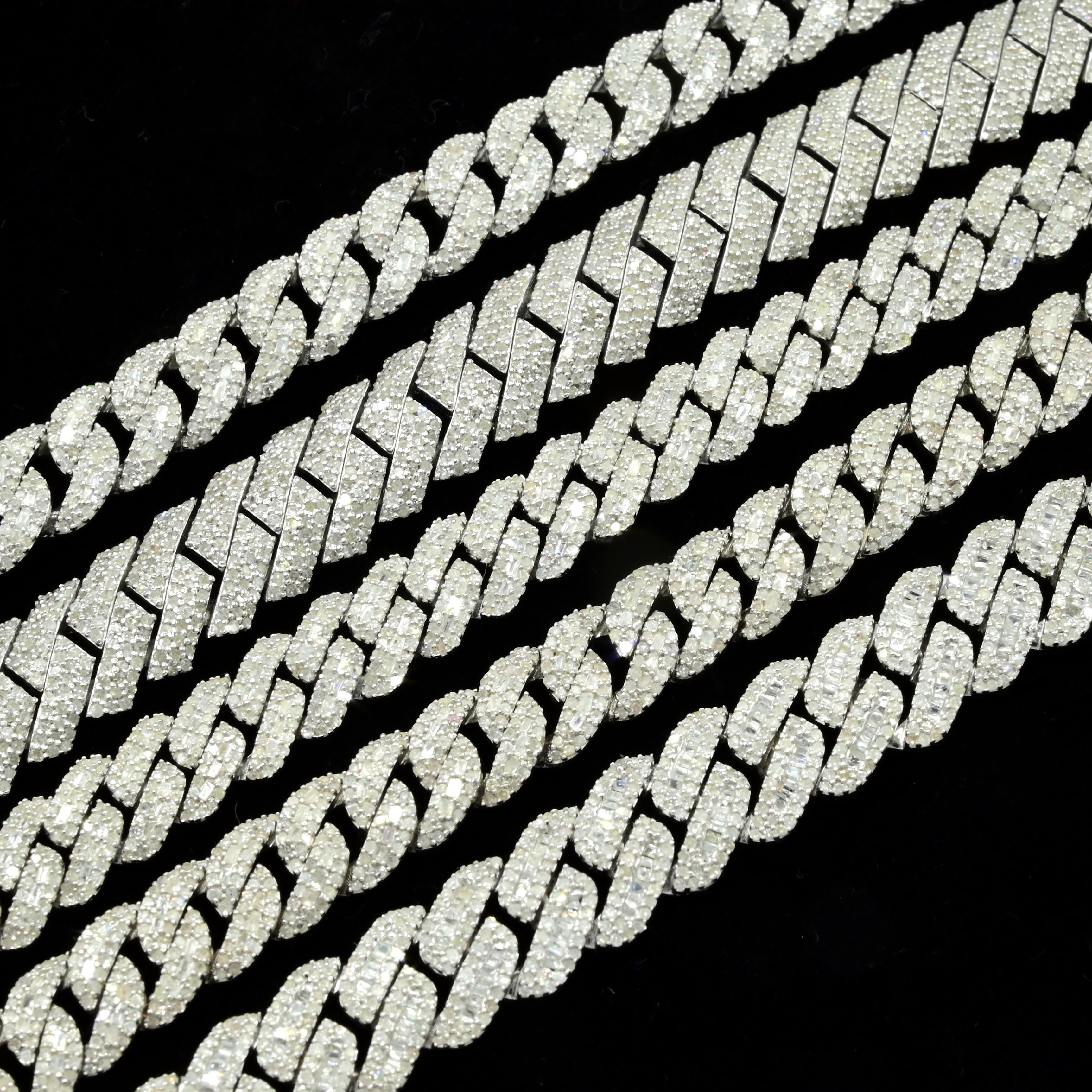 This 18" Cuban link necklace is expertly crafted from premium 925 sterling silver and measures 8mm in width, delivering a strong and masculine appeal. It is set with a combined total of 10.70 carats of both round and baguette diamonds, providing exceptional sparkle. With a weight of 59.44 grams, this necklace combines significant heft with meticulous craftsmanship for a distinguished, luxurious accessory.