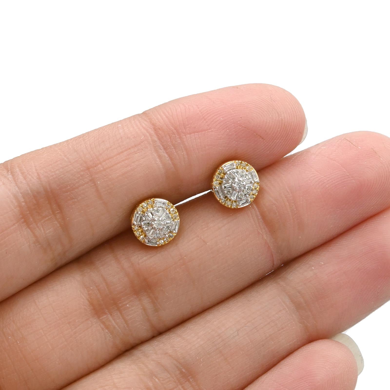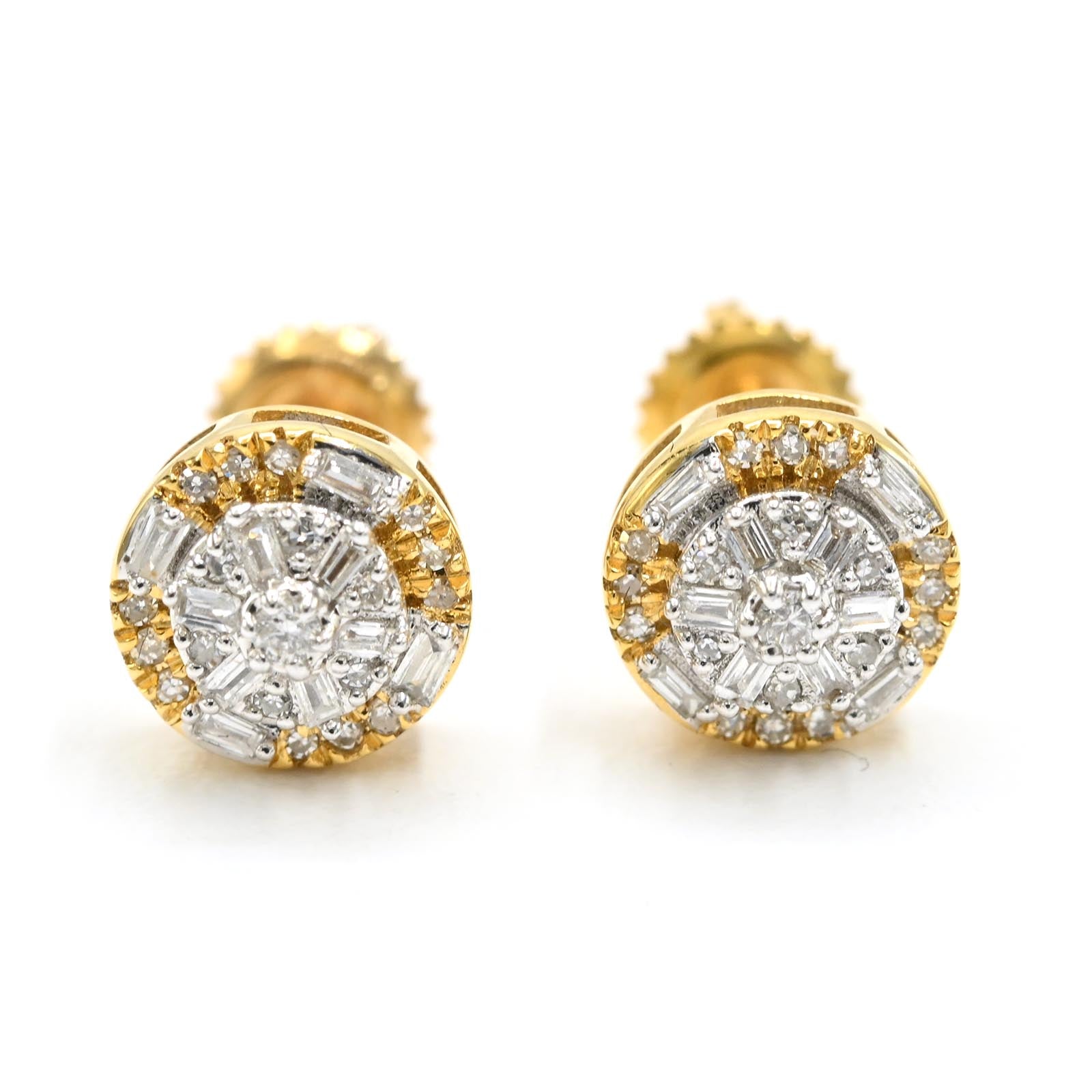 Crafted in 10k yellow gold, these elegant studs feature 0.20 carats total weight of natural baguette diamonds arranged to enhance their brilliance. Weighing 1.6 grams, their refined design offers a sophisticated sparkle suitable for both daily wear and special occasions, blending classic style with expert craftsmanship.