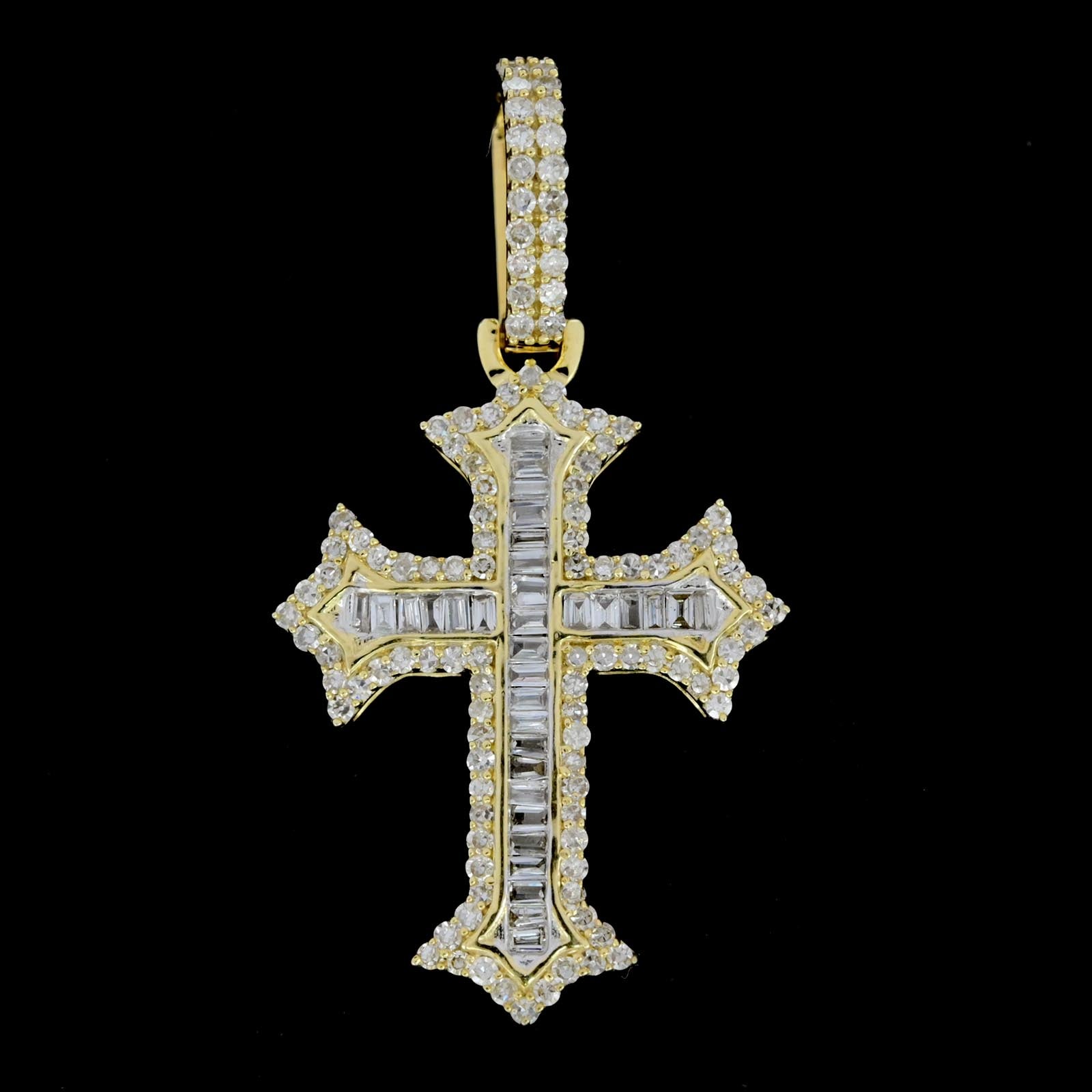Crafted from pure 10k yellow gold, this men's cross pendant features a total of 0.7 carats of round and baguette diamonds, delivering refined brilliance and timeless style. Weighing 3.1 grams, it combines durability with elegance, making it a sophisticated accessory suitable for everyday wear or special occasions. Its classic design provides a meaningful statement piece that reflects craftsmanship and quality.