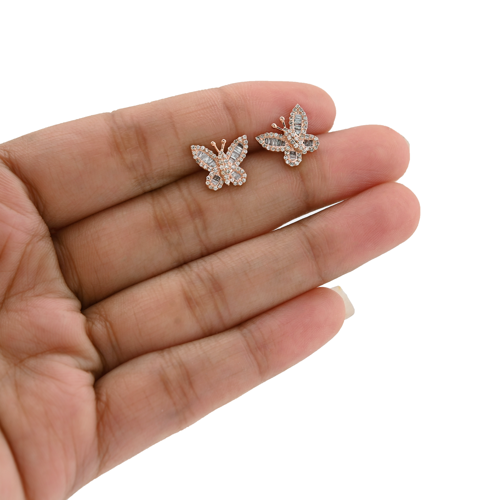 These exquisite butterfly studs in pure 10k rose gold feature 0.46 carats of natural diamonds, celebrating feminine elegance through warm metallic sophistication. At 2.2 grams per earring, they command presence with refined proportions perfect for extended wear. The diamonds sparkle luminously against rose gold's romantic hue, creating a captivating interplay of light that enhances the butterfly's delicate silhouette. Designed specifically for women who appreciate jewelry that combines symbolic meaning with contemporary luxury, these studs evoke transformation and natural grace. Seamlessly transitioning from professional environments to evening occasions, they represent a timeless investment in quality craftsmanship. An ideal choice for those seeking meaningful jewelry that celebrates both personal style and the enduring beauty of natural diamonds.