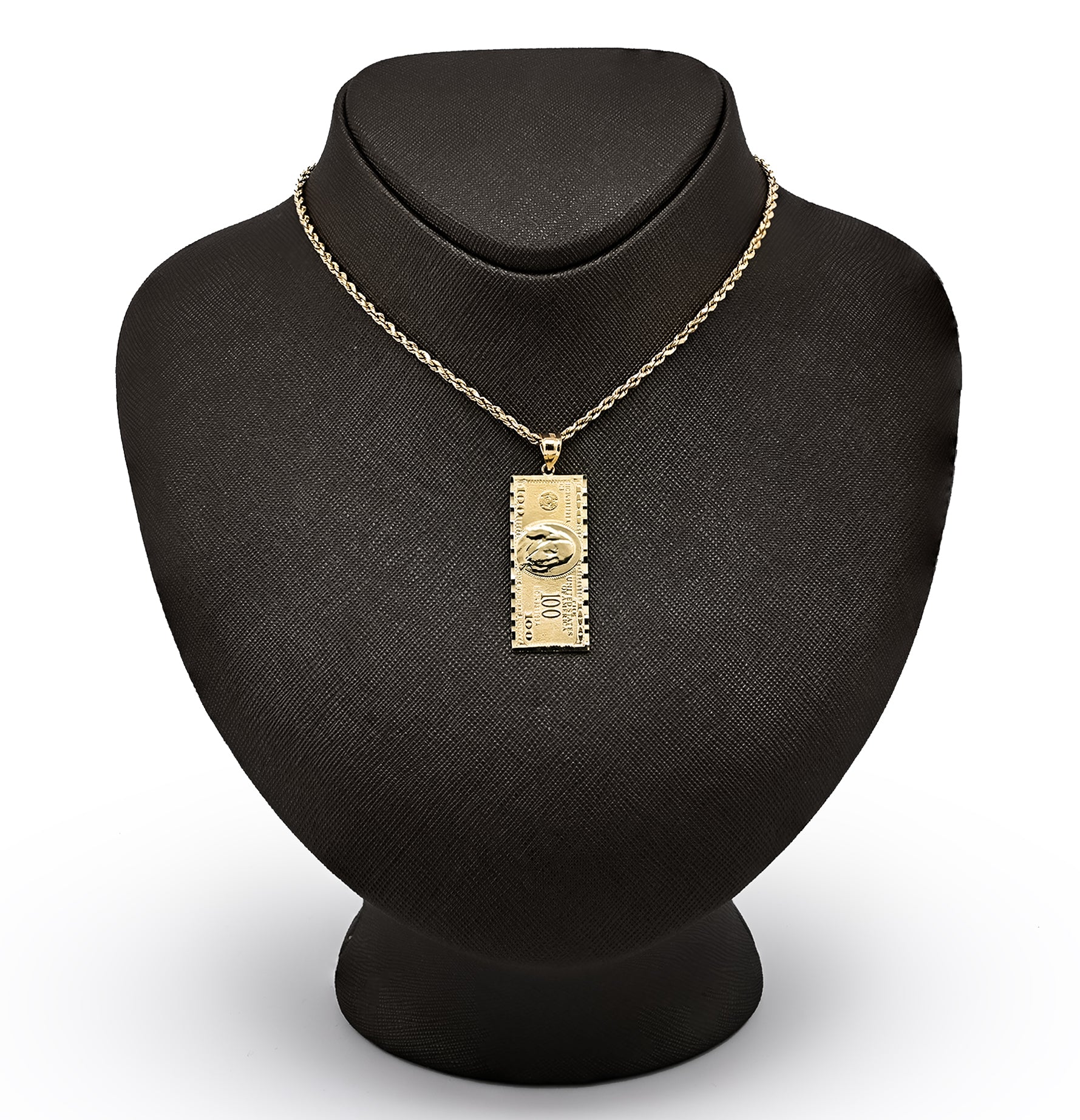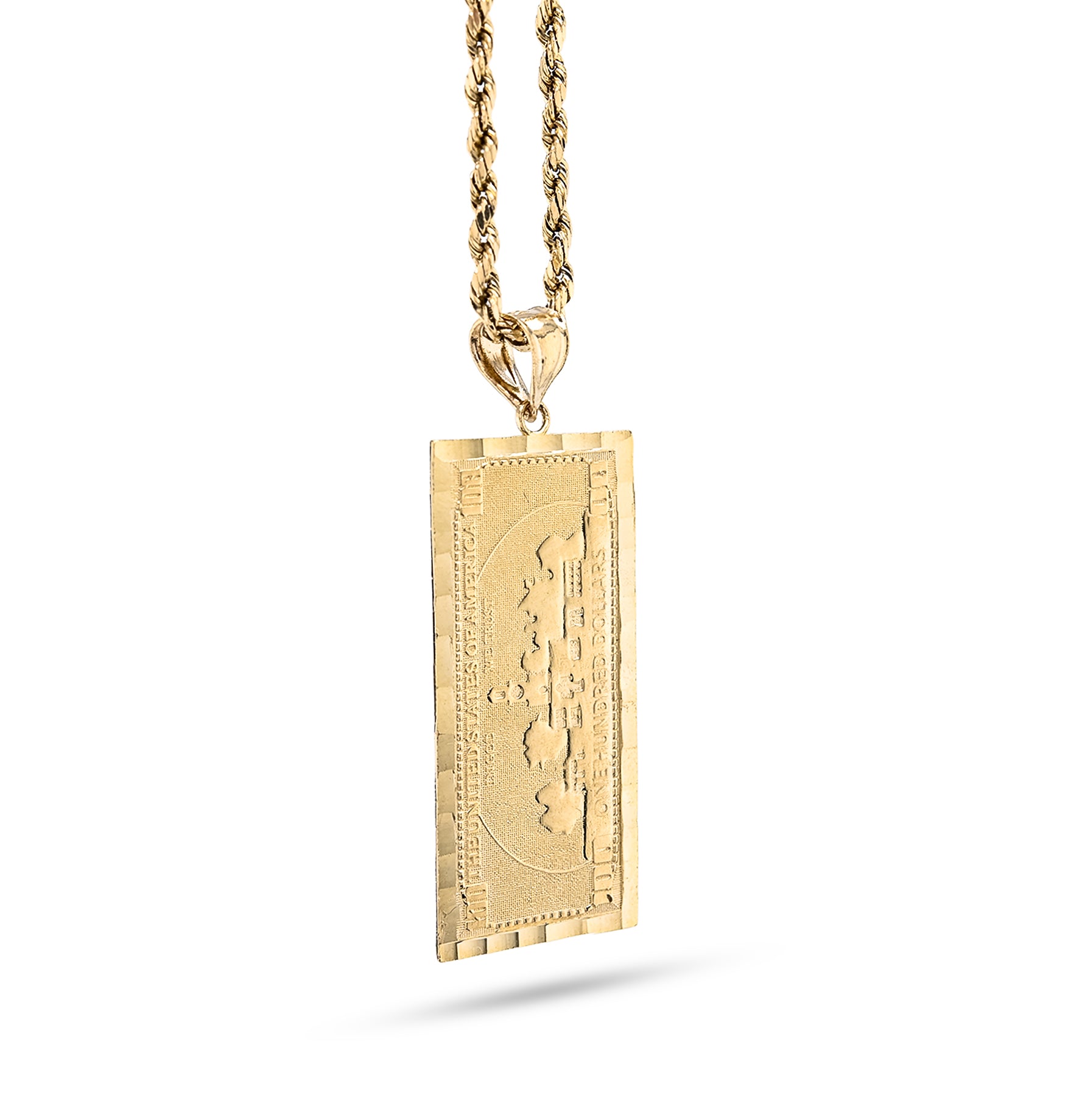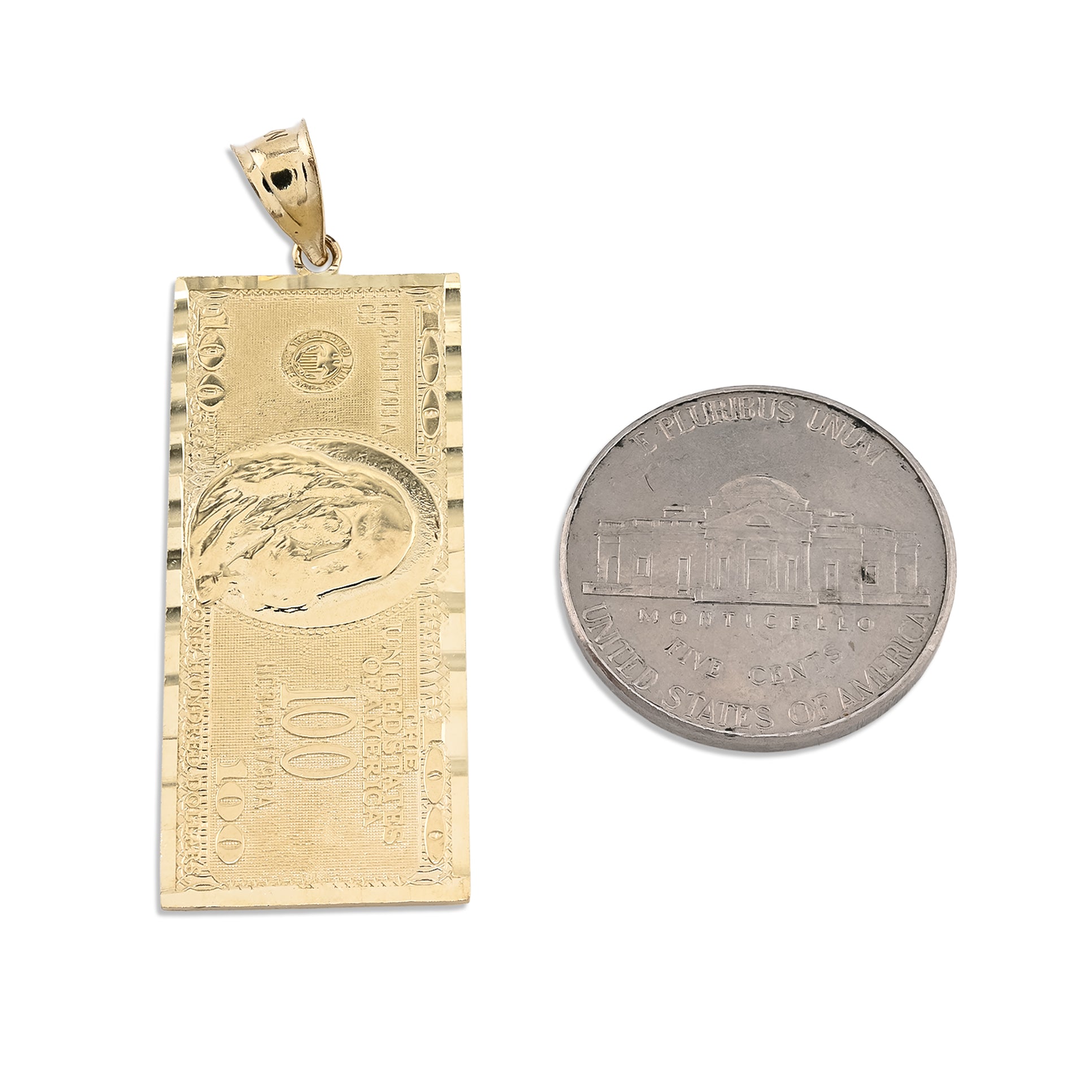 Bold ambition takes tangible form with this distinctive 10k yellow gold pendant crafted in the shape of a $100 bill. The detailed design captures iconic currency imagery in precious metal, transforming a symbol of prosperity into wearable art. At 4.3 grams, this substantial charm delivers confident presence ideal for men seeking to express their relationship with success and wealth. Whether celebrating financial achievement or embracing aspirational symbolism, this pendant makes an unmistakable statement that blends contemporary edge with refined craftsmanship.