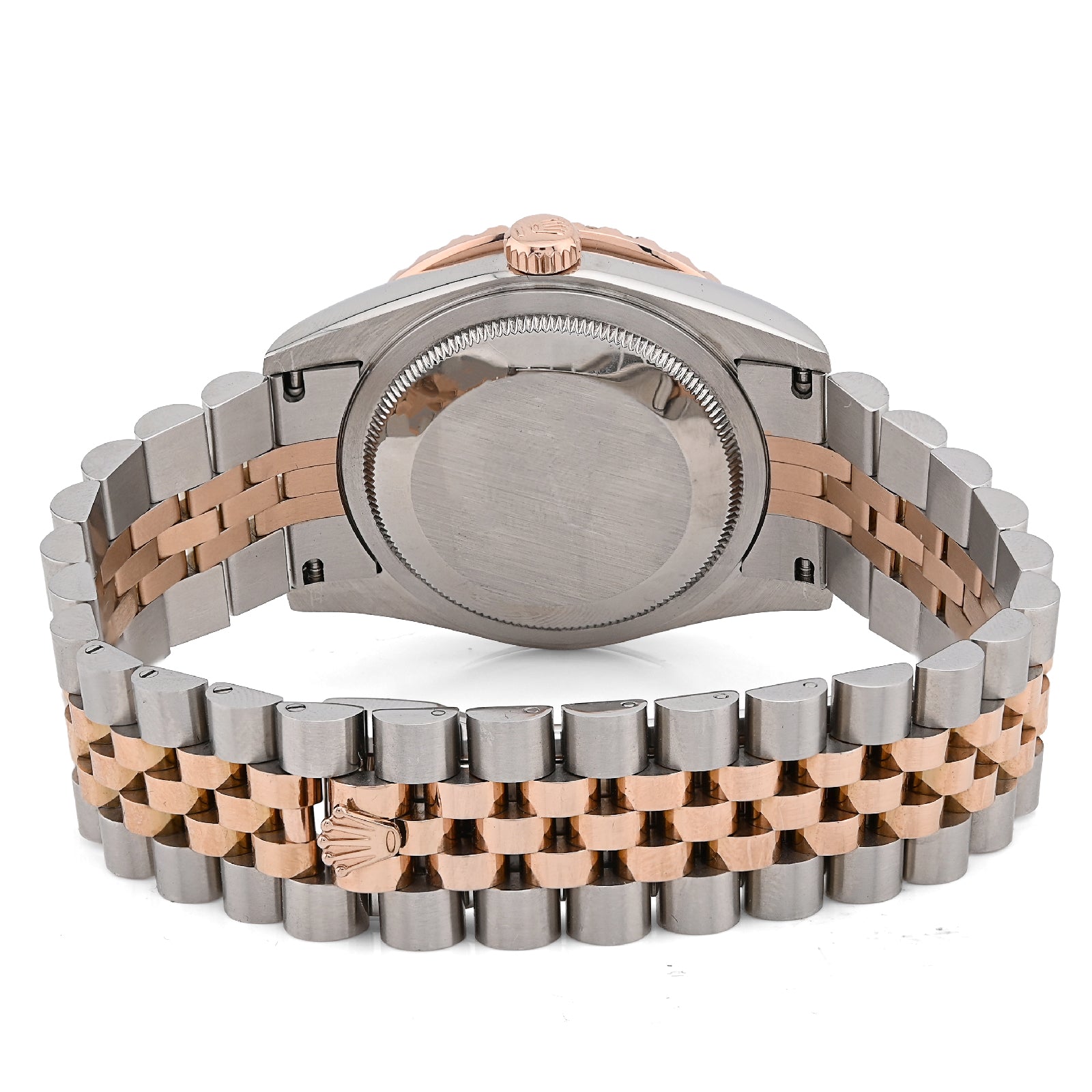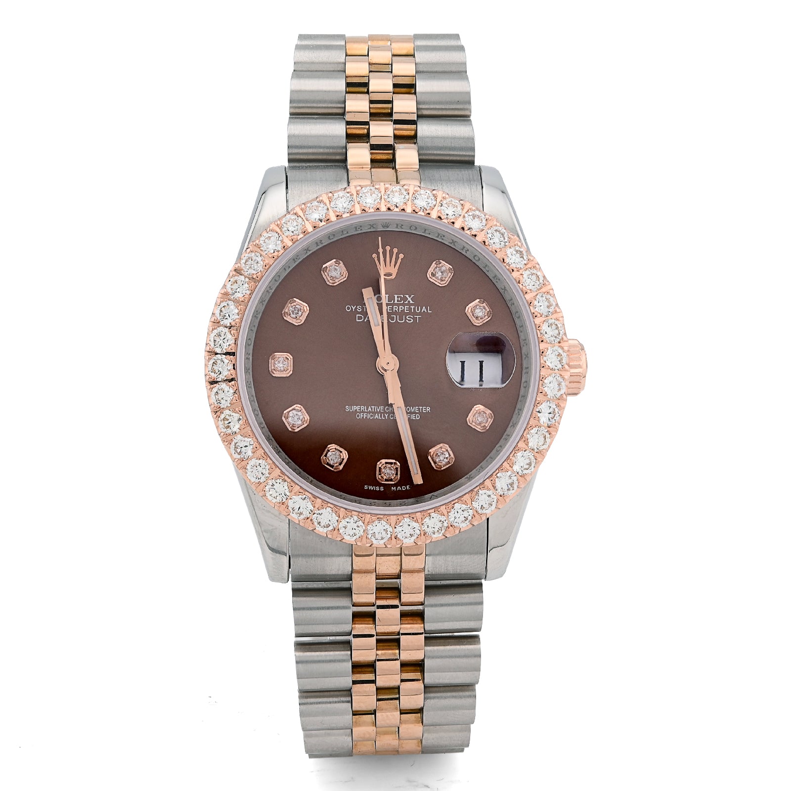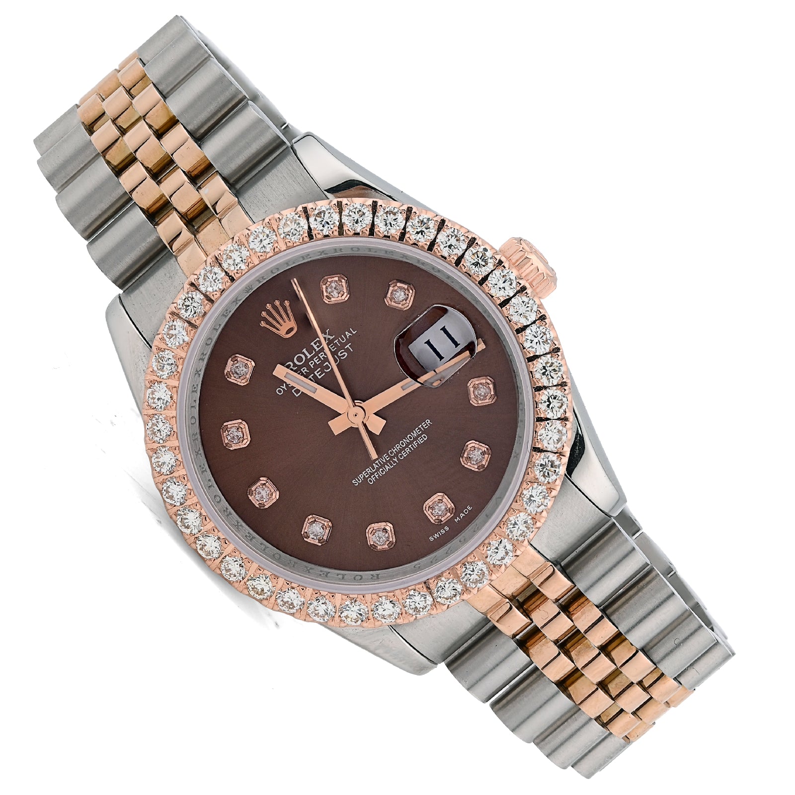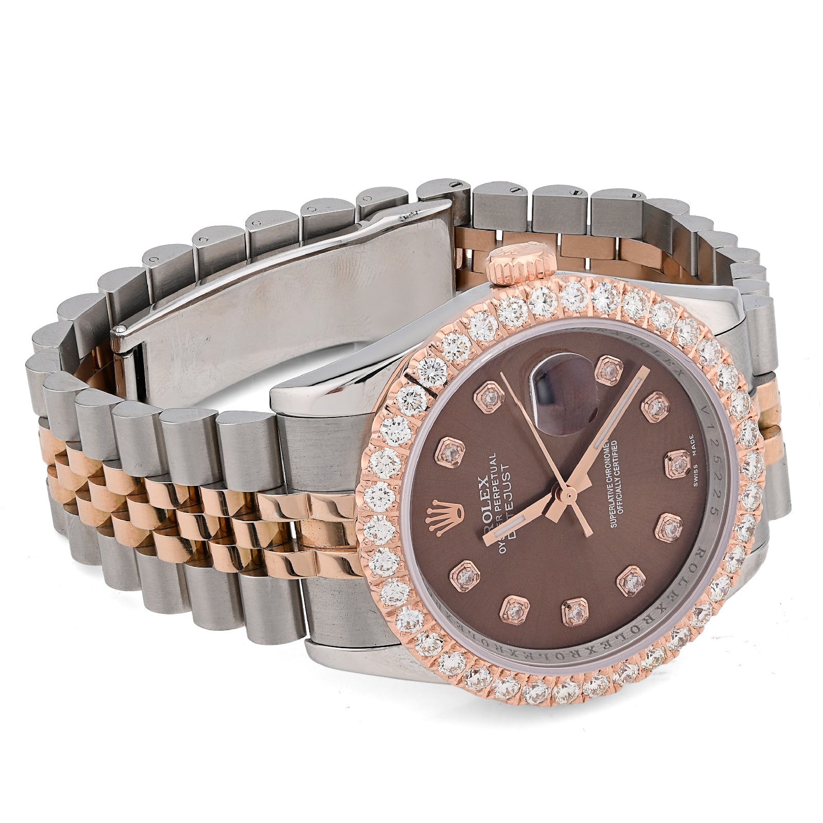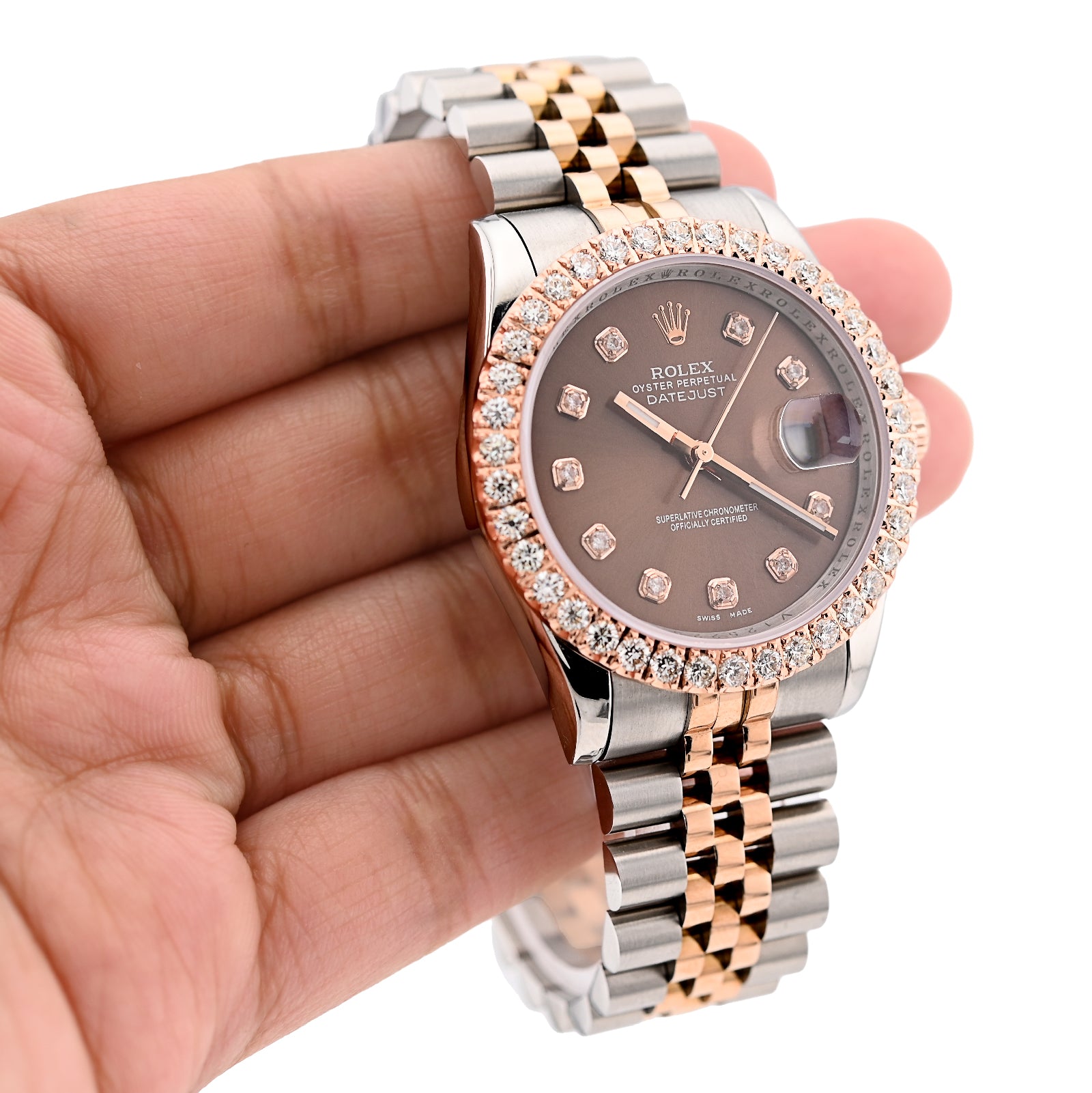 A timeless luxury timepiece combining classic elegance with contemporary sophistication. This Rolex Datejust features a striking 36MM case crafted from rose gold and stainless steel, complemented by a chocolate diamond dial and bezel set with 3.28 carats of brilliant diamonds. The hidden clasp mechanism ensures a seamless, refined appearance on the wrist. Precision engineering meets exquisite design in this iconic watch, perfect for those who appreciate fine craftsmanship and enduring style. An investment piece that transcends trends and occasions.