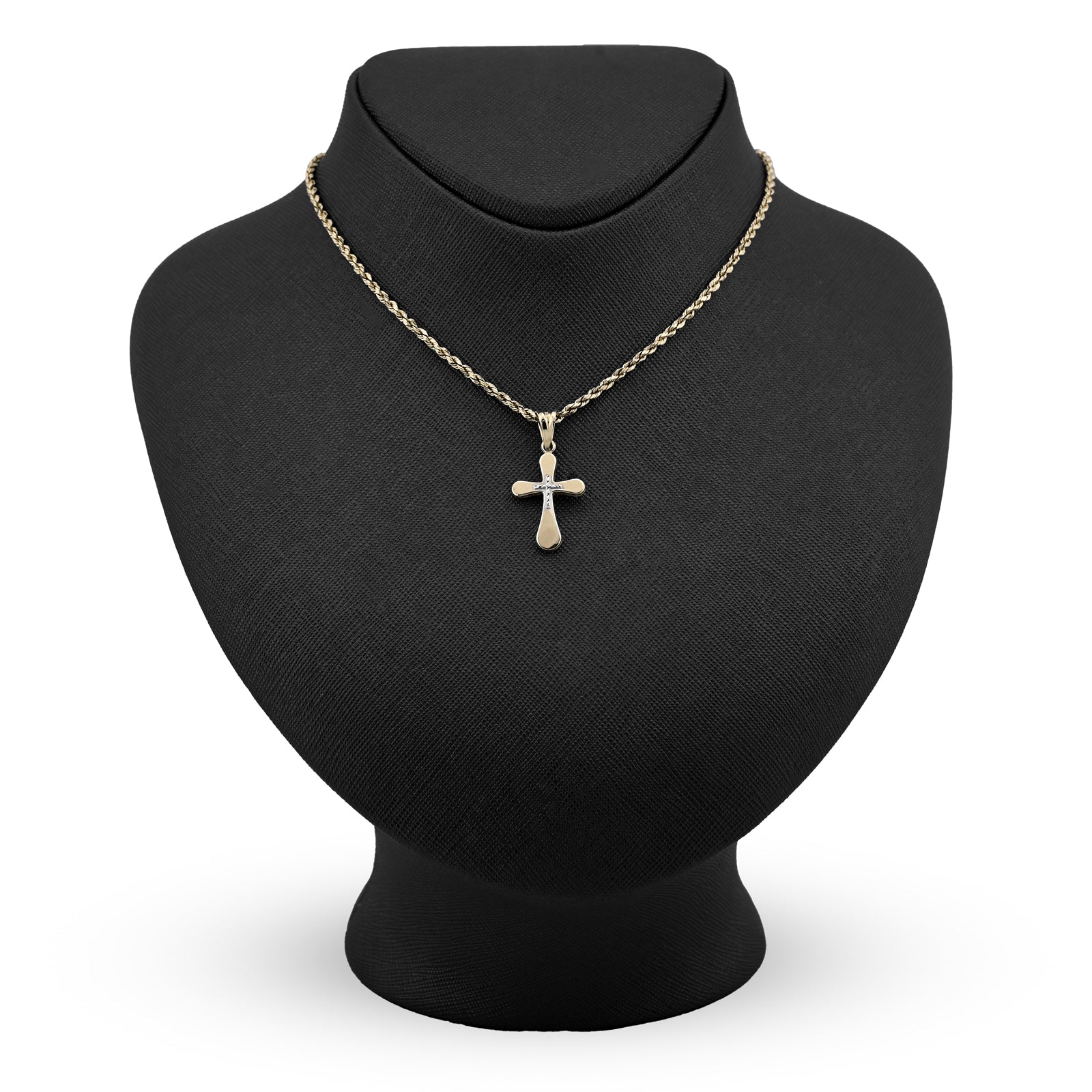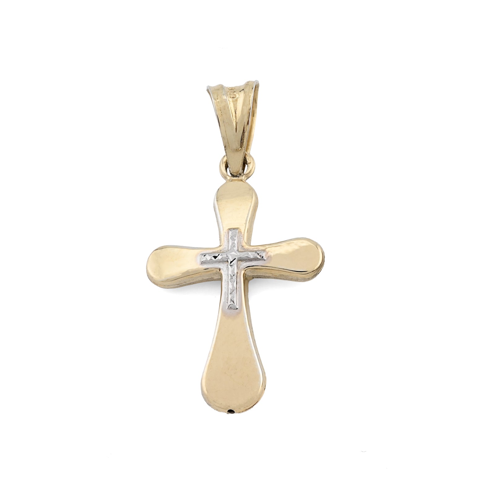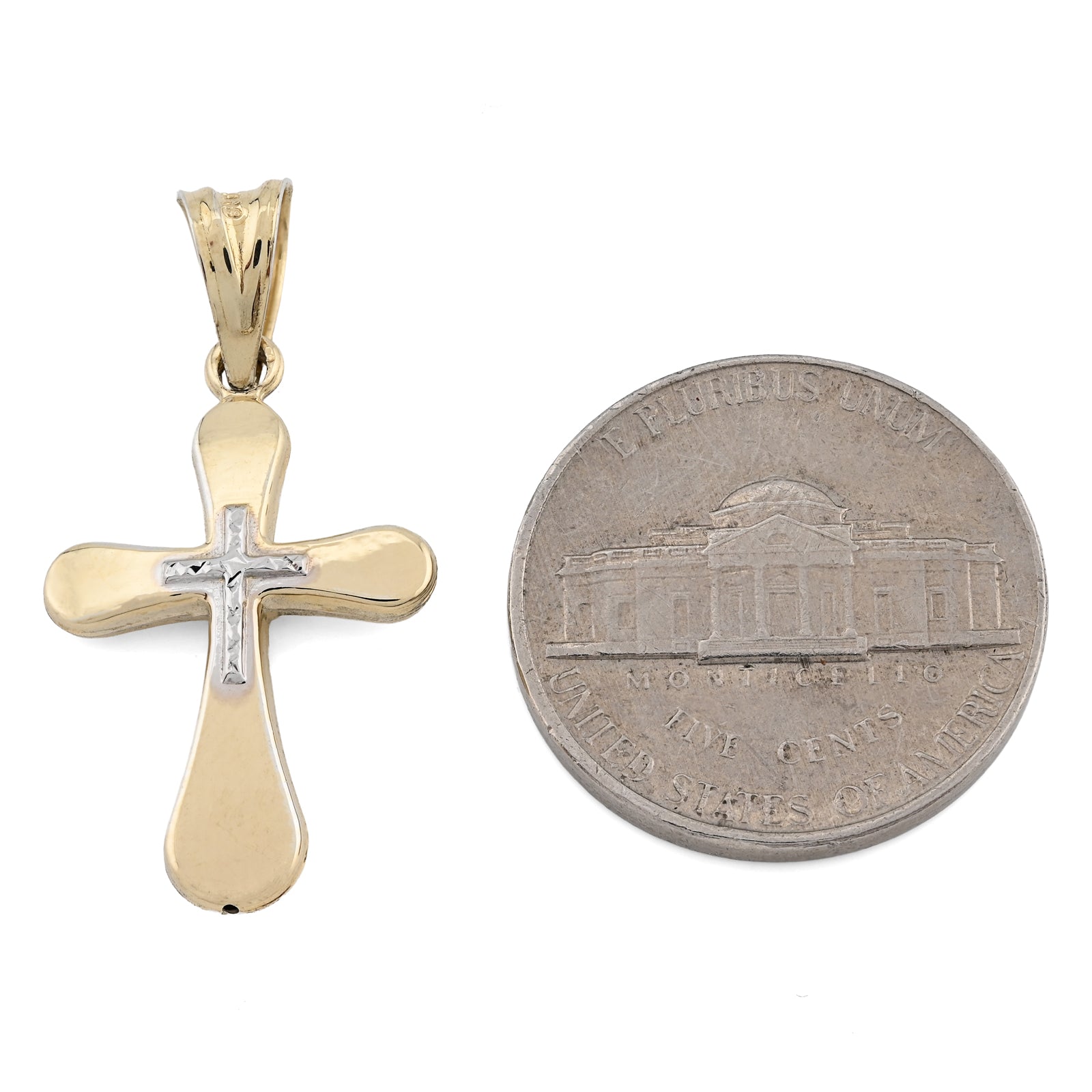 Embrace timeless faith with this exquisite cross pendant, refined to its purest form. Fashioned from 925 sterling silver with 1/10th 10k gold bonding in a sophisticated two-tone finish, the diamond-cut surface creates luminous facets that catch light with understated brilliance. At merely 0.7 grams, this featherweight charm represents the ultimate in delicate elegance, perfect for layering or as a subtle daily devotional piece. The faceted detailing adds contemporary sophistication to this classic religious symbol. An exceptional choice for those seeking minimalist spirituality combined with superior craftsmanship and refined aesthetic sensibility.