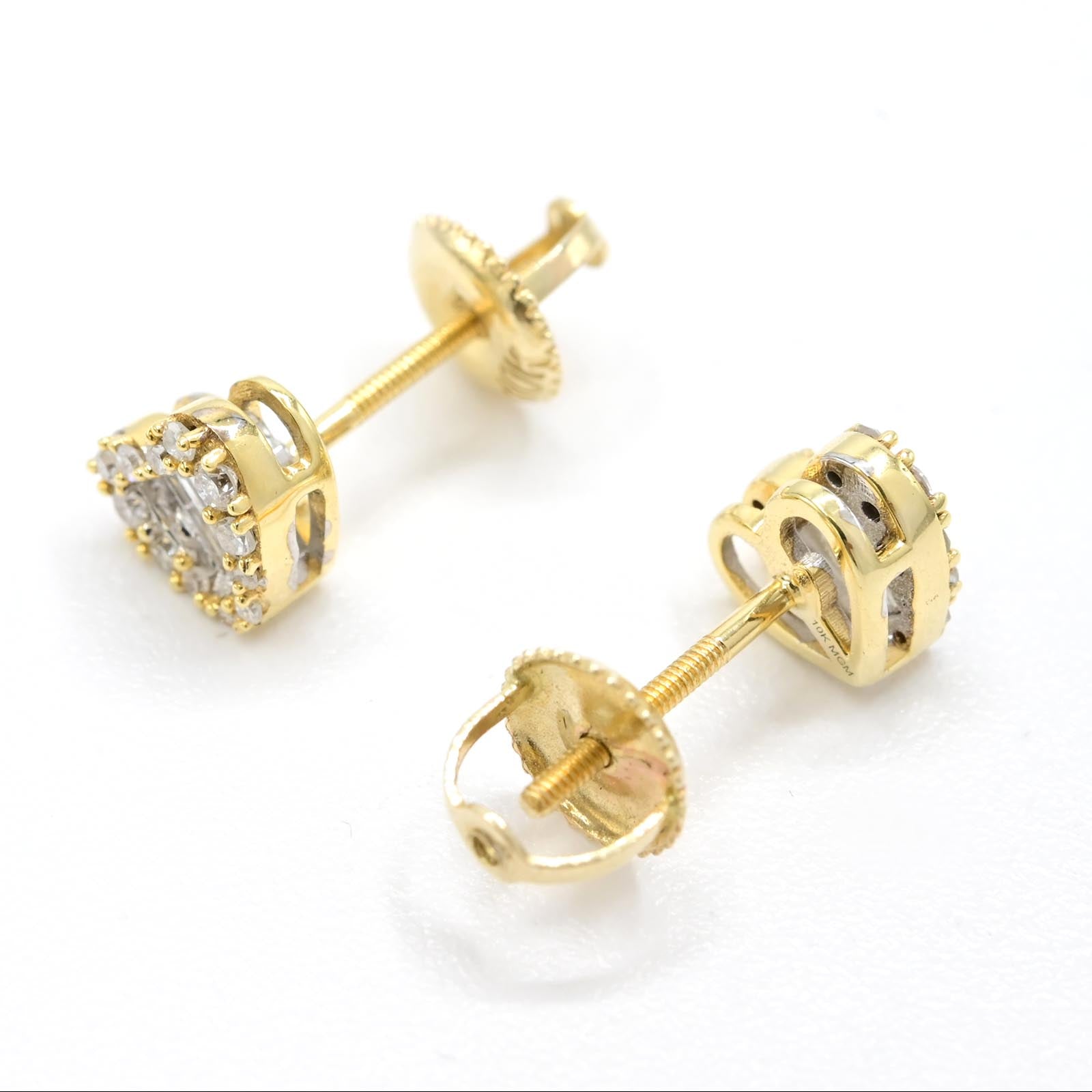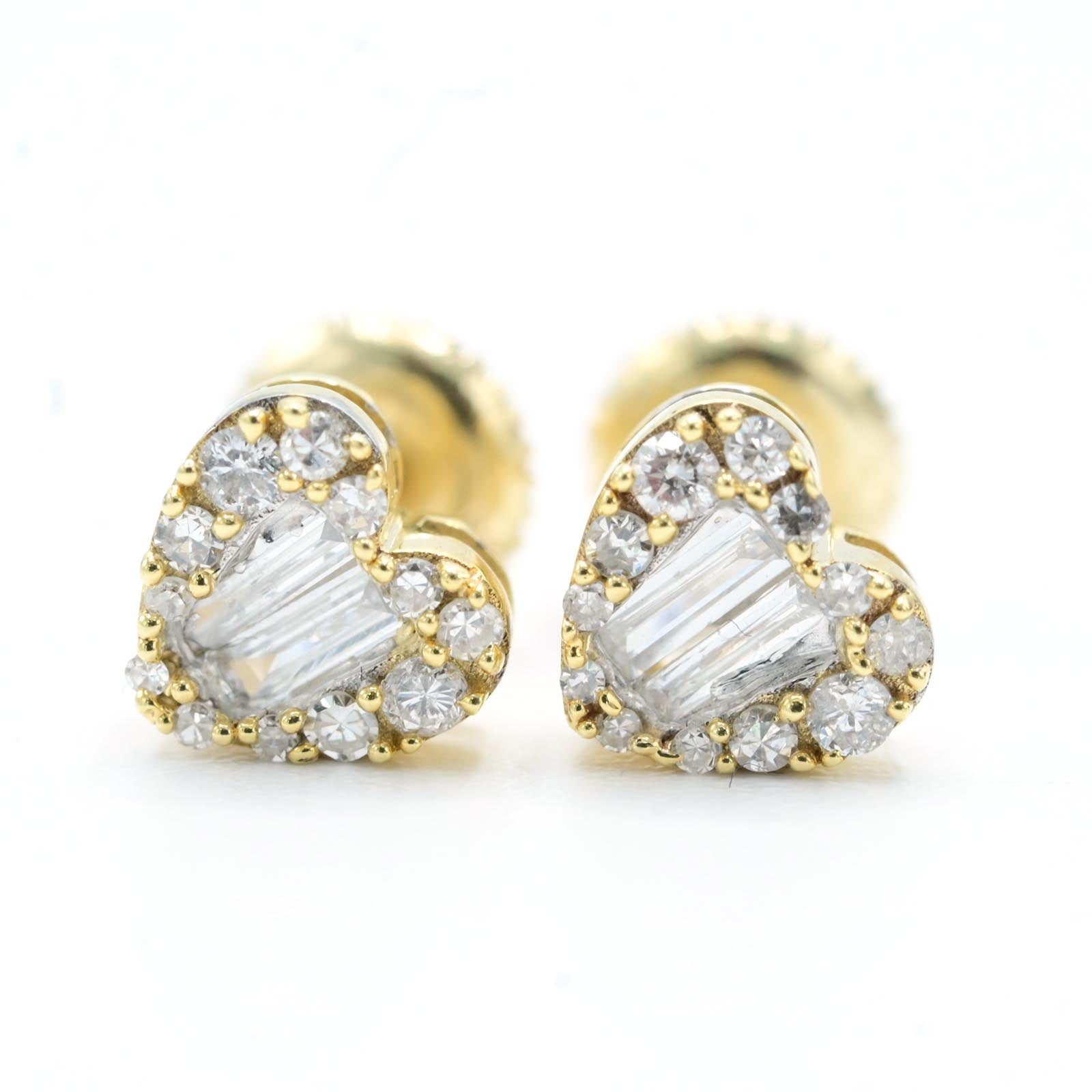 These women's stud earrings showcase a heart-shaped design crafted in 10k yellow gold, weighing 1.4 grams for comfortable wear. Featuring 0.32 carats total weight of natural baguette-cut diamonds, they offer a refined sparkle with a modern edge. Perfect for adding subtle elegance to everyday looks or special occasions, these earrings combine quality craftsmanship and timeless style.