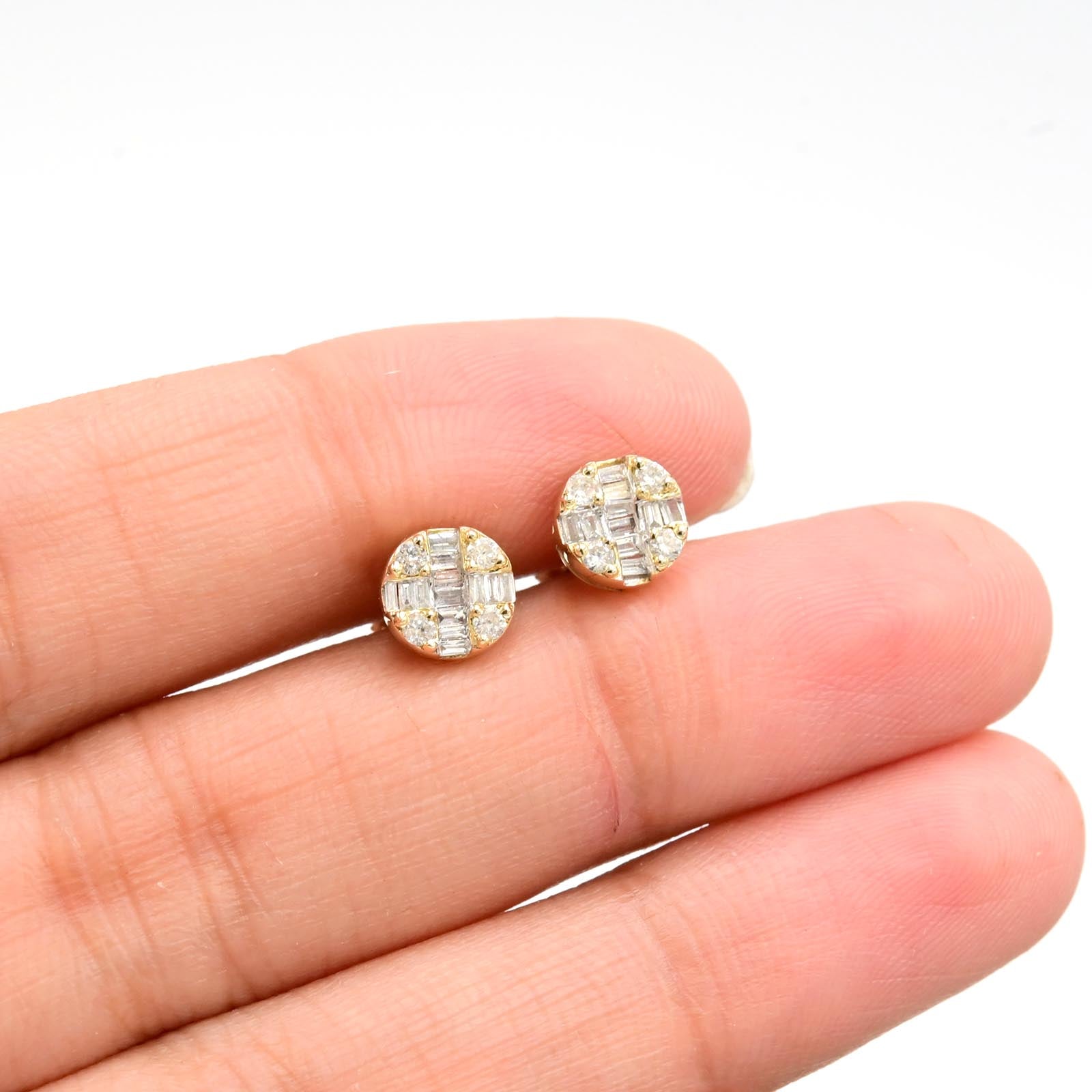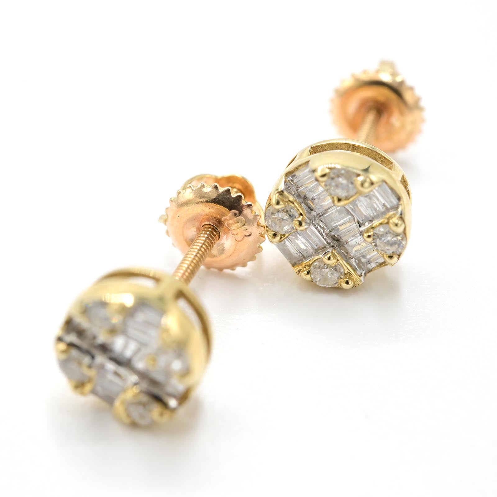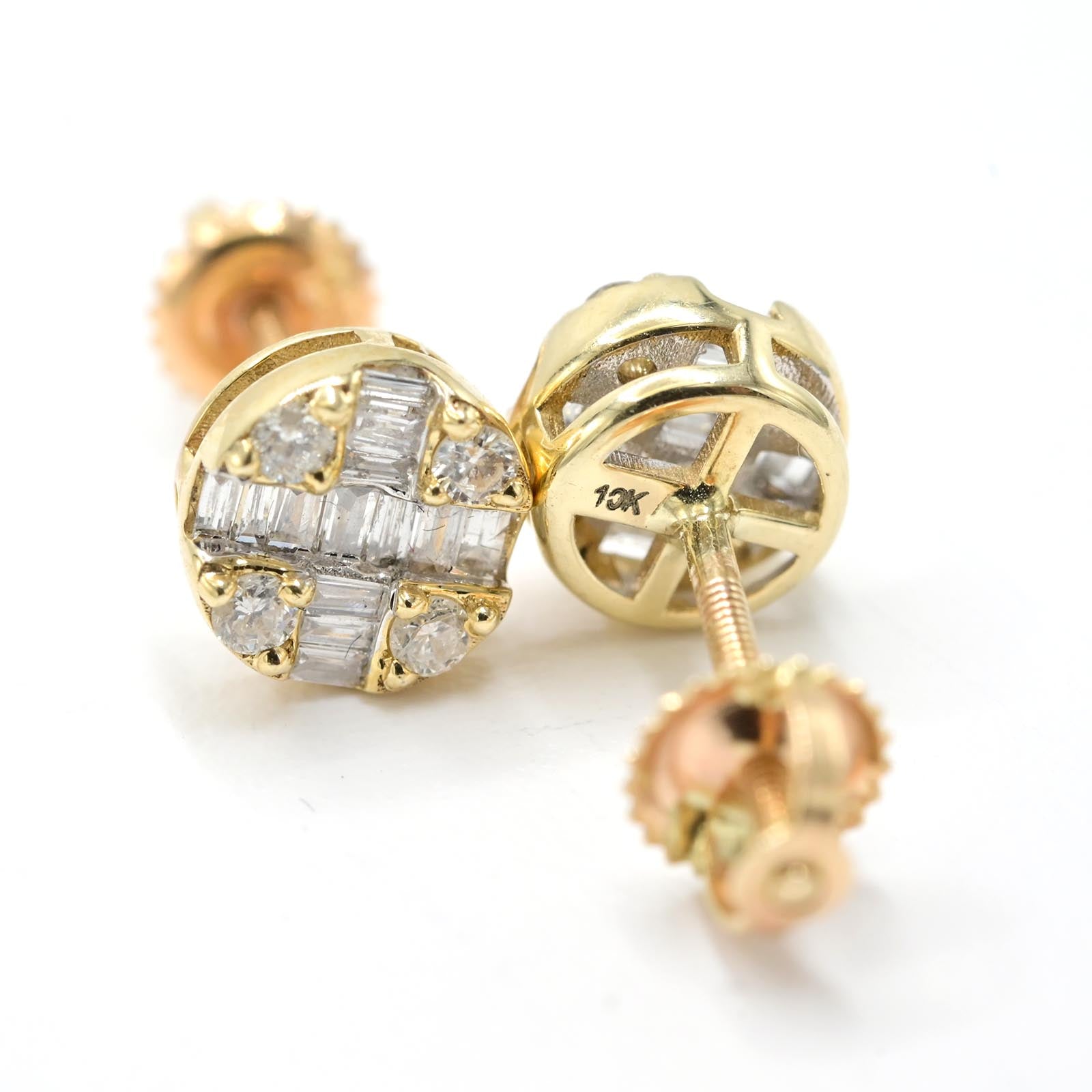 Crafted in 10k yellow gold, these women's stud earrings feature a total of 0.30 carats of natural baguette diamonds, expertly arranged to catch the light with subtle brilliance. Weighing 1.4 grams, their refined round design offers a timeless elegance suitable for daily wear or special occasions. Durable yet delicate, these earrings combine quality craftsmanship with classic style for a sophisticated accessory that enhances any look.